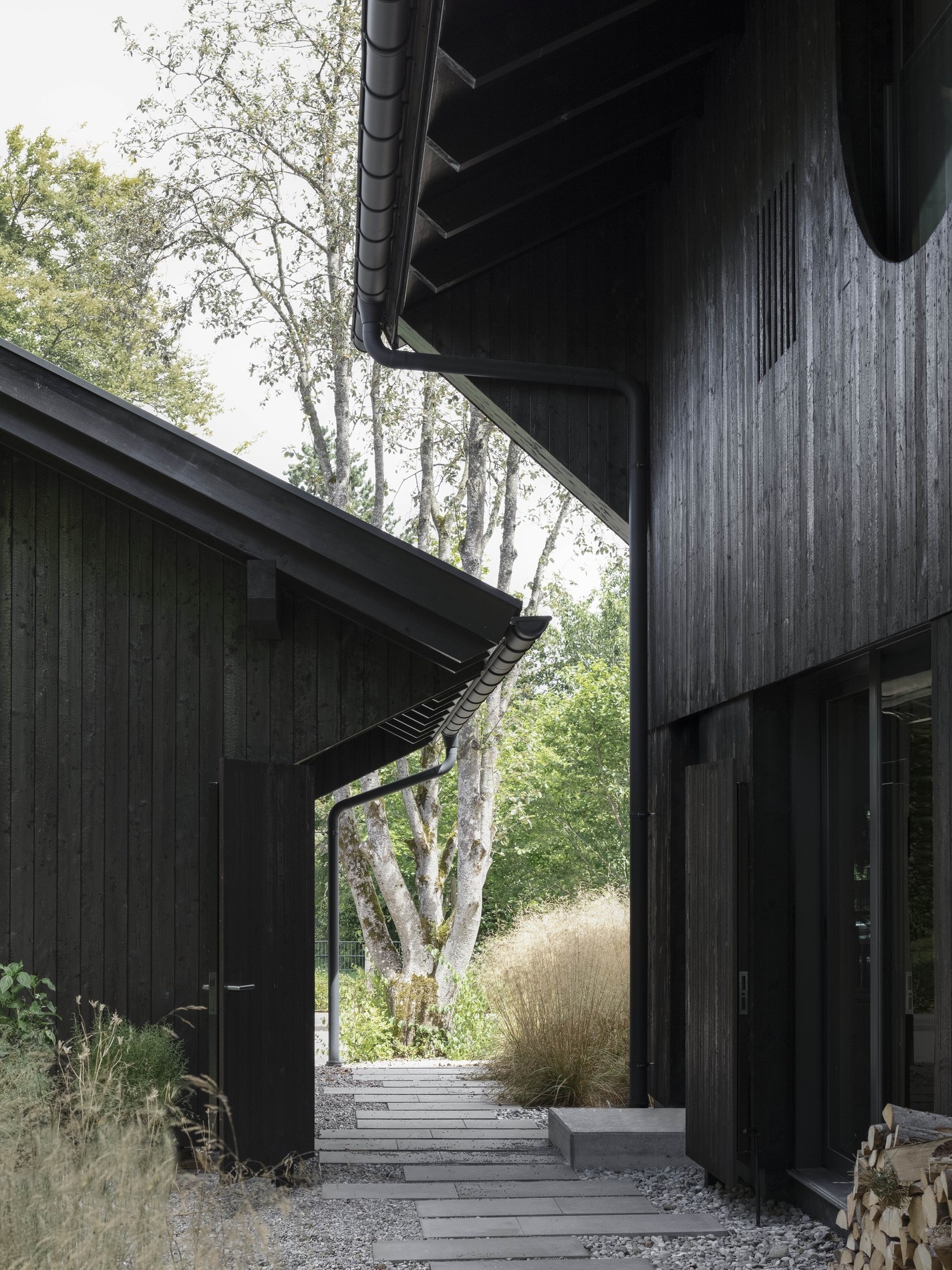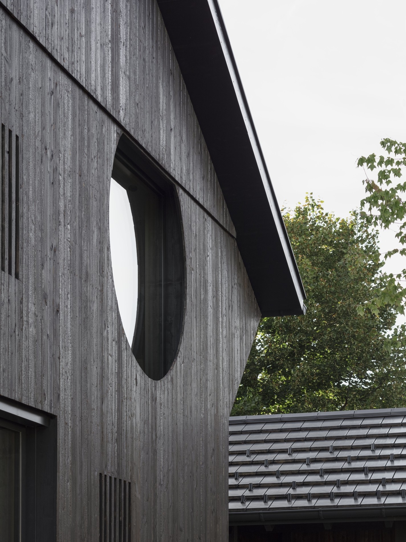 Členění černě opálené dřevěné fasády je spíše vedlejším výstupem navrženého designu. Je způsobeno spíš než tvůrčím záměrem omezenou délkou prken. Poznat to ale nejde. A podobně jako u místních stodol je celý dřevěný fasádní obklad uspořádán odshora dolů tak, aby nedocházelo ke vzlínání vody do čela prken. Domy, jež srostly v jeden a vyplnily volný prostor mezi sebou, byly navrženy pro tři generace jedné rodiny. Zvenčí jsou domy téměř identické, ale vnitřní uspořádání se liší podle potřeb obyvatel.