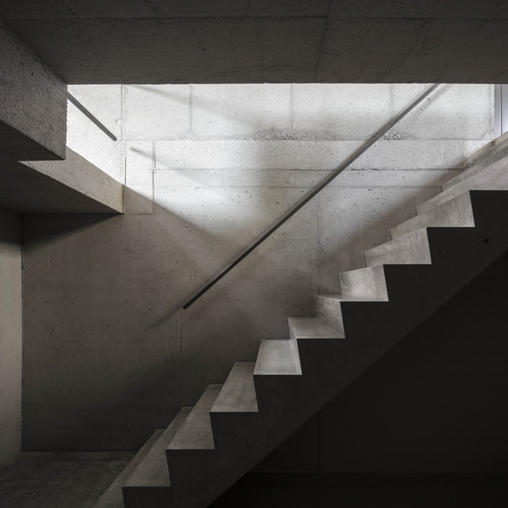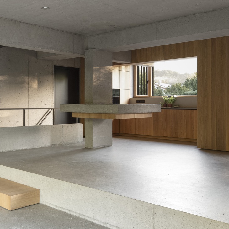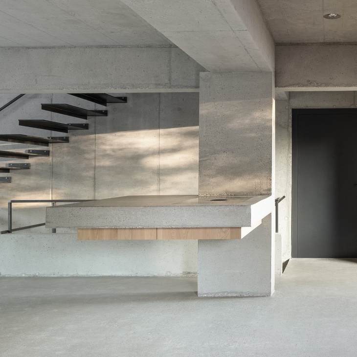 Některé prvky byly navrženy přímo jako součást hrubé stavby – například kuchyňská deska byla odlitá z betonu přímo na jeden z nosných sloupů. Konstrukce se tak stává součástí vybavení.