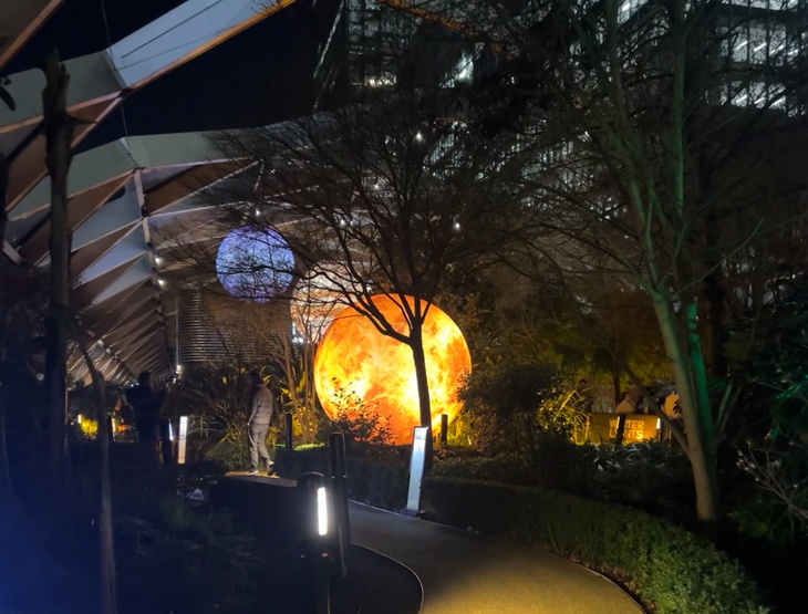 Instalace Sol přenáší sluneční soustavu do zahradního prostoru Crossrail Place Roof Garden. Země i planety od Merkuru po Neptun plují nad korunami stromů, připomínají propojenost s vesmírem a symbolizují lásku, odvahu či moudrost. Dílo vás zve k zastavení a vnímání harmonie, kreativity a soucitu, které planety symbolizují.