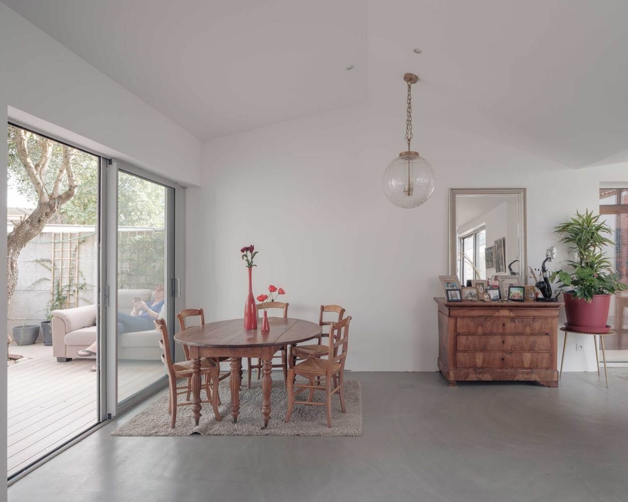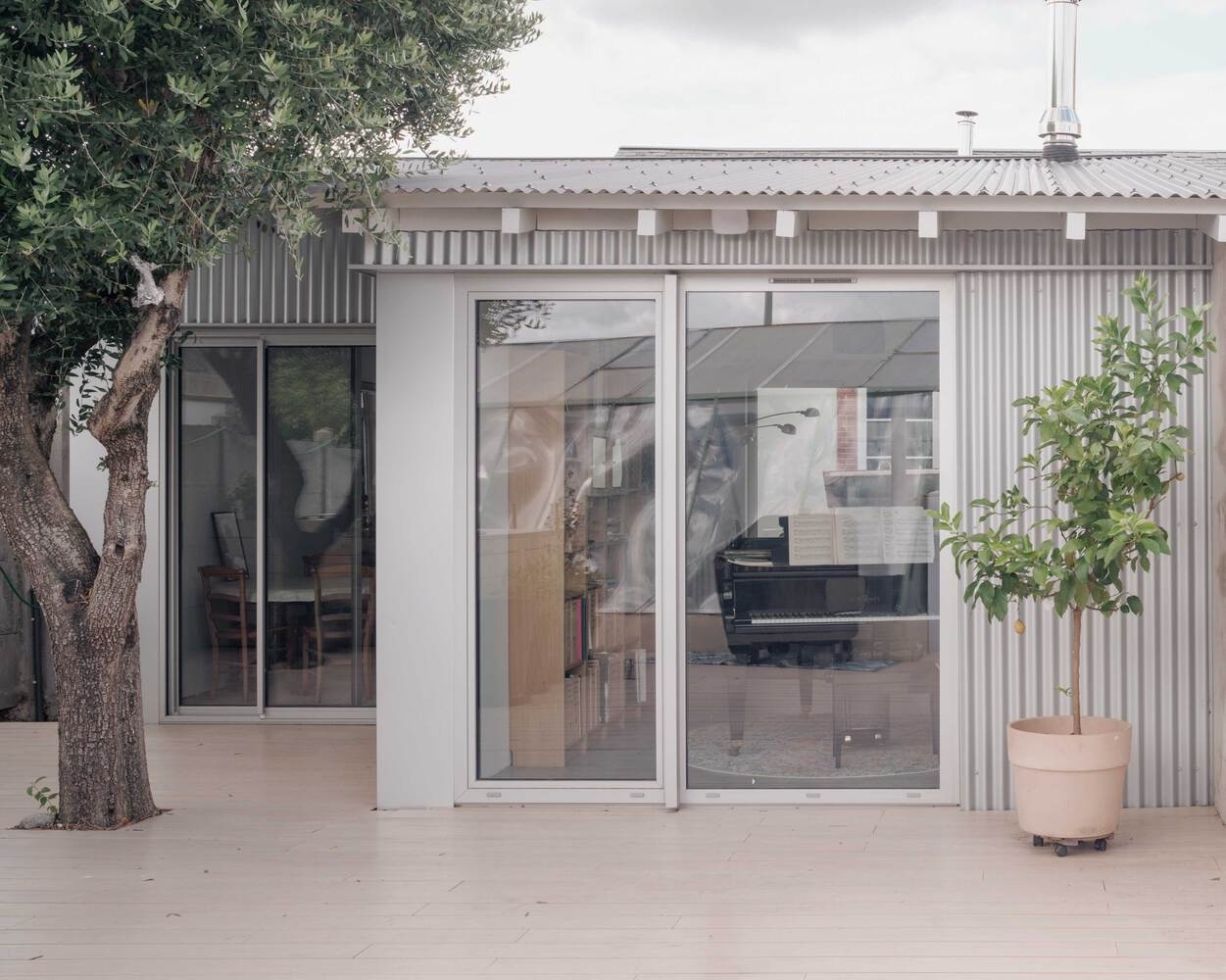 Je to ostatně patrné i z toho, že přístavba zároveň zachovává dva vzrostlé olivovníky, po předchozích majitelích. Olivovníky mohou růst stovky let, a tak by asi bylo škoda je likvidovat jen kvůli takové malichernosti, která ve výsledku zvýšila užitnou plochu domácnosti na 137 metrů čtverečních. Z té vyčíslené rozlohy to tak úplně nevyzní, ale majitelé domu si skutečně polepšili. I díky tomu, že chytře řešená přístavba sice nenásobí metry rozlohy, ale násobí možnosti. V případě hezkého počasí se skrze přístavbu stává „obyvatelnou“ celá zahrada. A zájem obyvatel o pobyt venku nevyprchá ani s příchodem podzimu, díky kryté terase.
