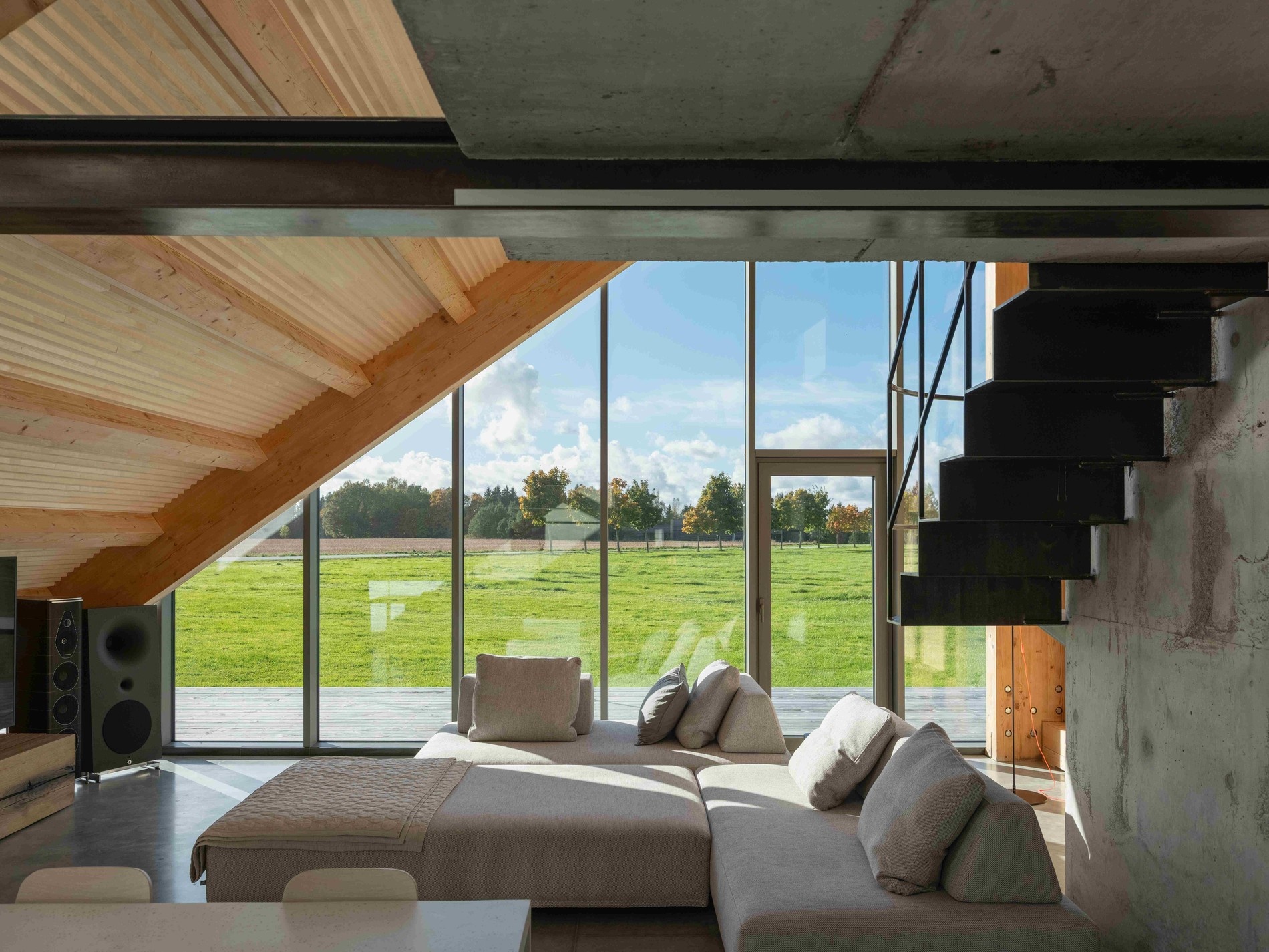 Toto duo materiálů vytváří estetiku podobnou loftu – prostor je dostatečně odolný pro práci, ale zároveň dostatečně kultivovaný pro relaxaci. Foto: Lukas Mykolaitis