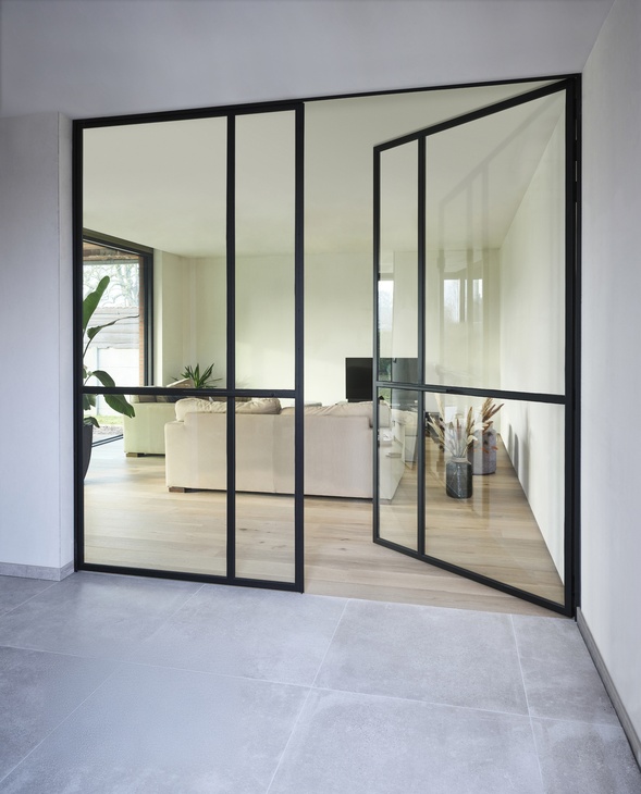 Výběr typu zasklení je téměř bez omezení, od čirého a mléčného až po kouřové či ornamentní struktury. Standardní povrchová úprava v černé barvě RAL 9005 podtrhuje industriální charakter. Na přání jsou však dostupné i další odstíny. K dispozici jsou také varianty v posuvném provedení.