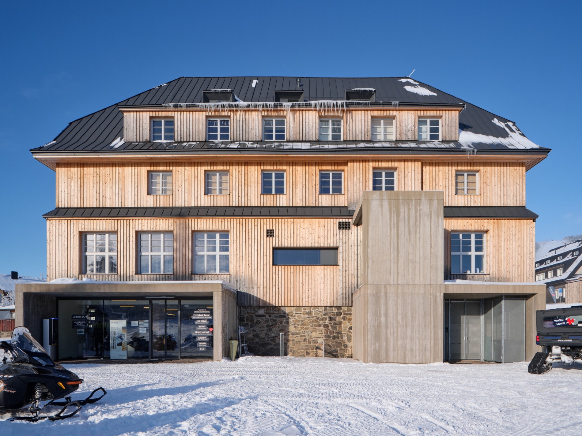 Mimo jiného zde nalezneme třeba kavárnu jako moderní prostor s terasou, známý nabídkou palačinek a výběrové kávy. Prodejna suvenýrů se zaměřuje na lokální a tradiční krkonošské výrobky i originální designové kousky. Multifunkční prostor slouží pro všemožné filmové večery a kulturní akce. V přízemí budovy se nachází půjčovna lyžařského vybavení a servis, která se v létě mění na půjčovnu horských kol a elektrokol. V multimediální expozici naleznete interaktivní výstavy, například expozici o olympijské historii a zimních sportech.