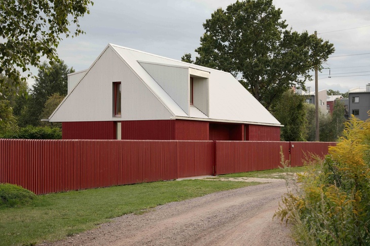 Červená Karkulka na kraji lesa? Ne tak docela. Rodinný dům, stojící v místech, kde Riga už přestává být městem a stává se lotyšskou vesnicí, totiž k nápadně červené barvě přidává i jasně bílou. Tam, kde se z dřevěného pláště stává střecha. I proto obydlí působí svěže, coby neočekávané zjevení.