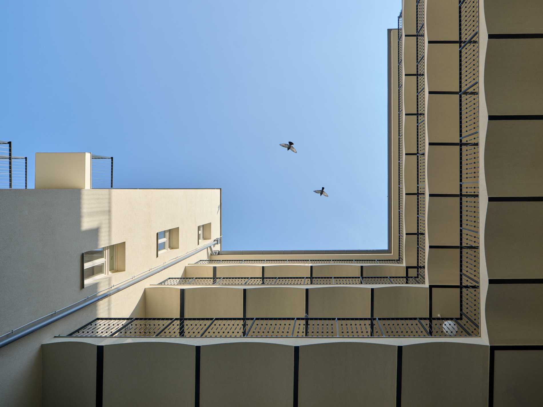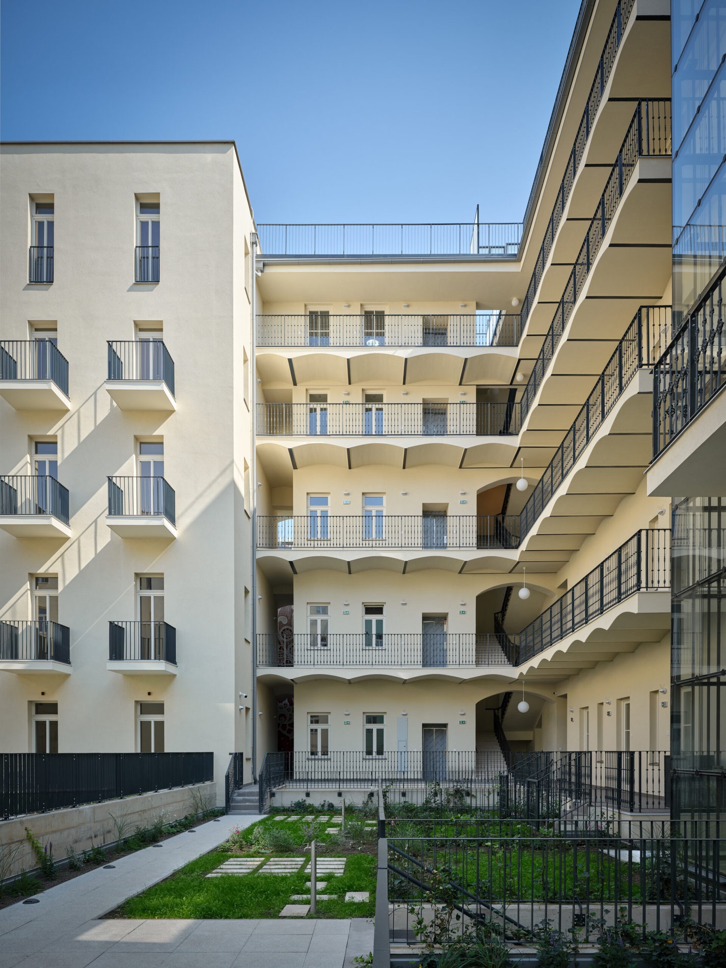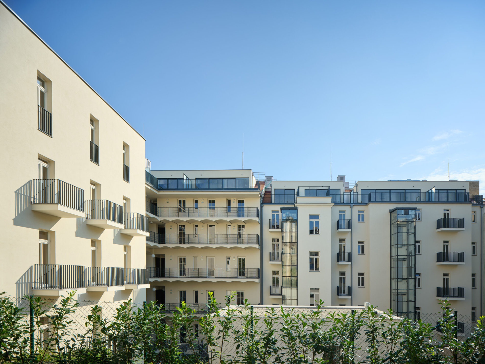 Noví majitelé se mohou těšit i na částečně zařízené kuchyně. Nechybějí ani garážová stání ve vnitrobloku, kolárna, prádelna a společná terasa. Ve dvoře došlo k odstranění původních vestaveb, které byly ve špatném technickém stavu. Nahradily je garáže sloužící všem třem objektům, přičemž na střechách garáží vznikly předzahrádky pro byty ve druhém nadzemním podlaží. Tím se prostor dvora proměnil v plnohodnotnou obytnou zónu. Zároveň zde vznikl nový dvoupatrový loft,“ komentuje současný stav na procházce areálem architekt a předkládá zájemcům o nájemní bydlení celé architektonické řešení včetně půdorysů.