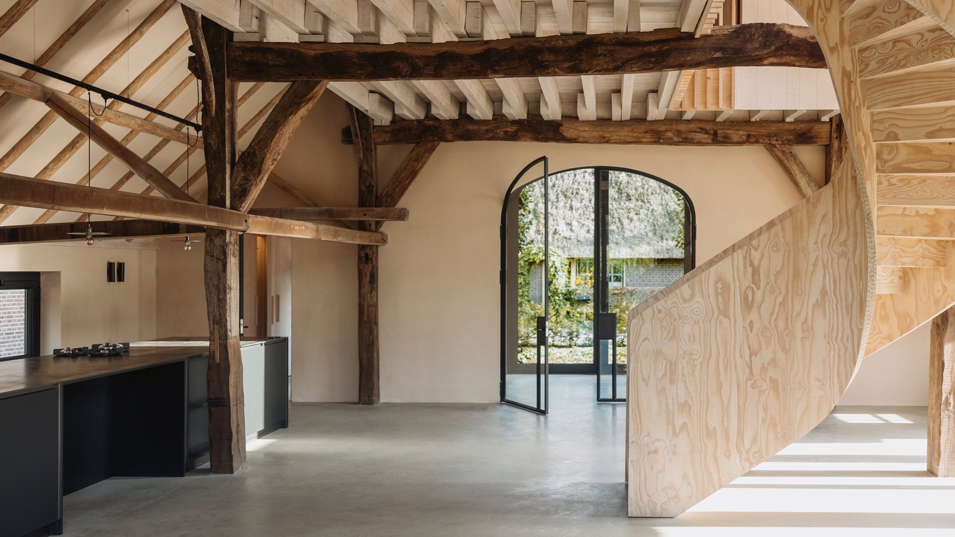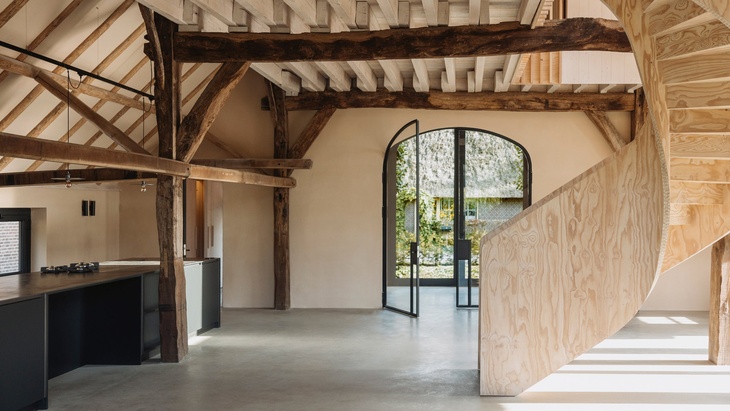 V úzké spolupráci s klientem se architektům podařilo proměnit původního ducha historické budovy, památkově chráněné staré nizozemské stodoly, v osobitý moderní dům. Cílem bylo spolehnout se na přírodní stavební materiály, vápenné omítky a len, při konstrukci stěn. A též absenci moderních doplňků. Staré a nové tu propojilo působivé schodiště.