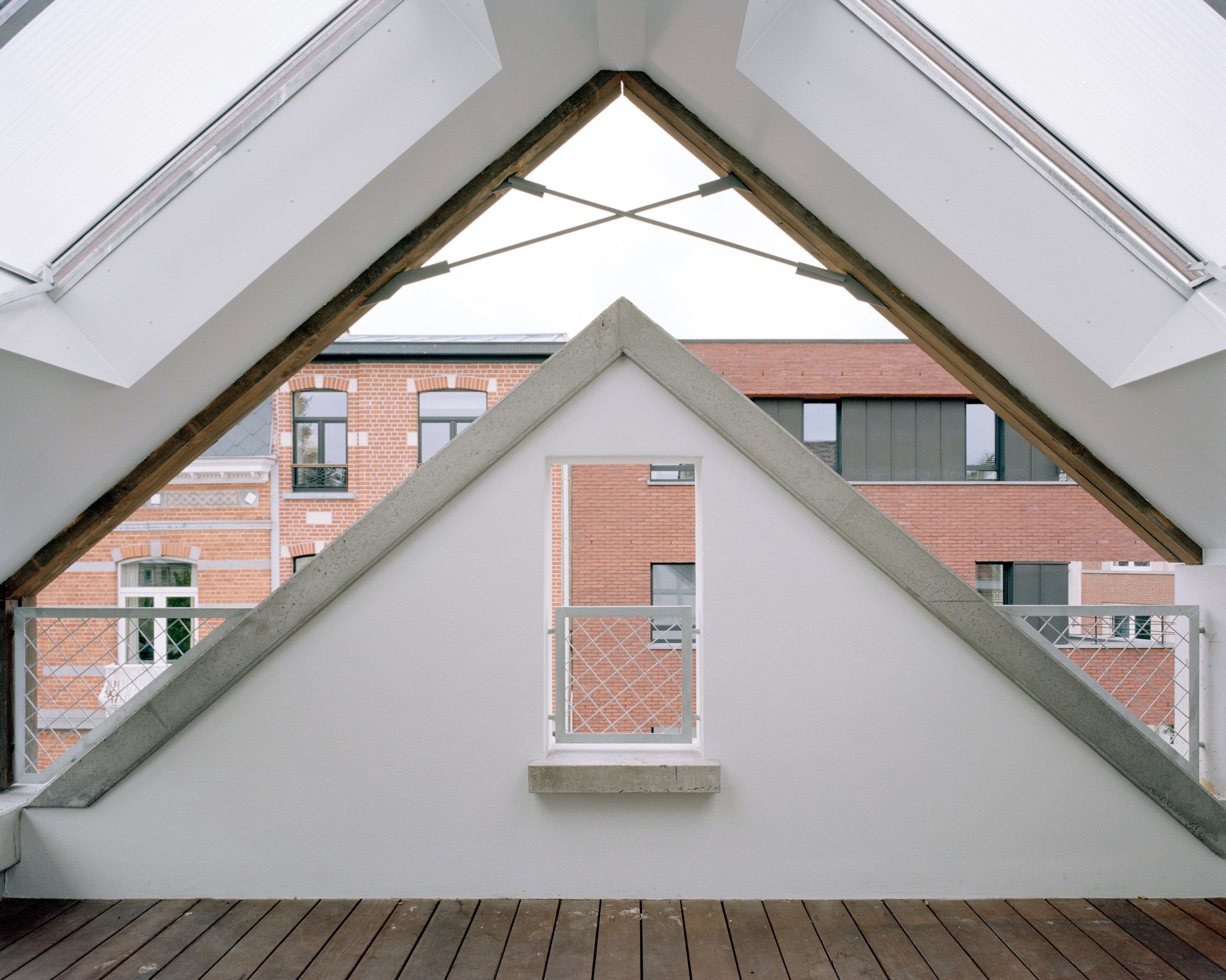 Toto gesto s vestavbou na půdě je ryze ekonomické. Zvyšuje hustotu, aniž by se změnil základní charakter budovy nebo zahltil její kontext. Foto: Maxime Delvaux