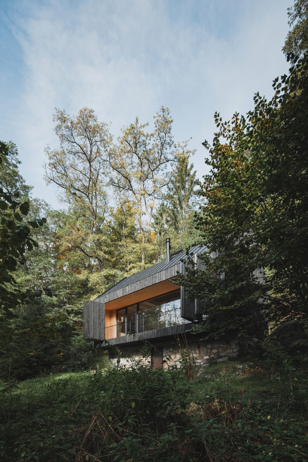 Dřevěná chata mezi skálou a řekou
