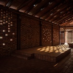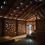 Díky způsobu překládání cihel vznikly v obvodových stěnách mezery, které zajišťují přirozenou klimatizaci a vzdušnost celé budově. Šachovnicový vzor vytváří mozaiku příhodnou mozaiku světla a zastínění, jehož úhel se mění v závislosti pohybu Slunce na obloze. Přednáškový sál se tak neustále "proměňuje". Langdon tento model stavby pojmenoval "Chameleon". Další zapracované stavební postupy a užité materiály (například nosné konstrukce střechy z výpletu eukalyptu, na kterých je usazeno pozinkované oplášťování) vesměs vzdává hold tradiční ugandské venkovské architektuře.