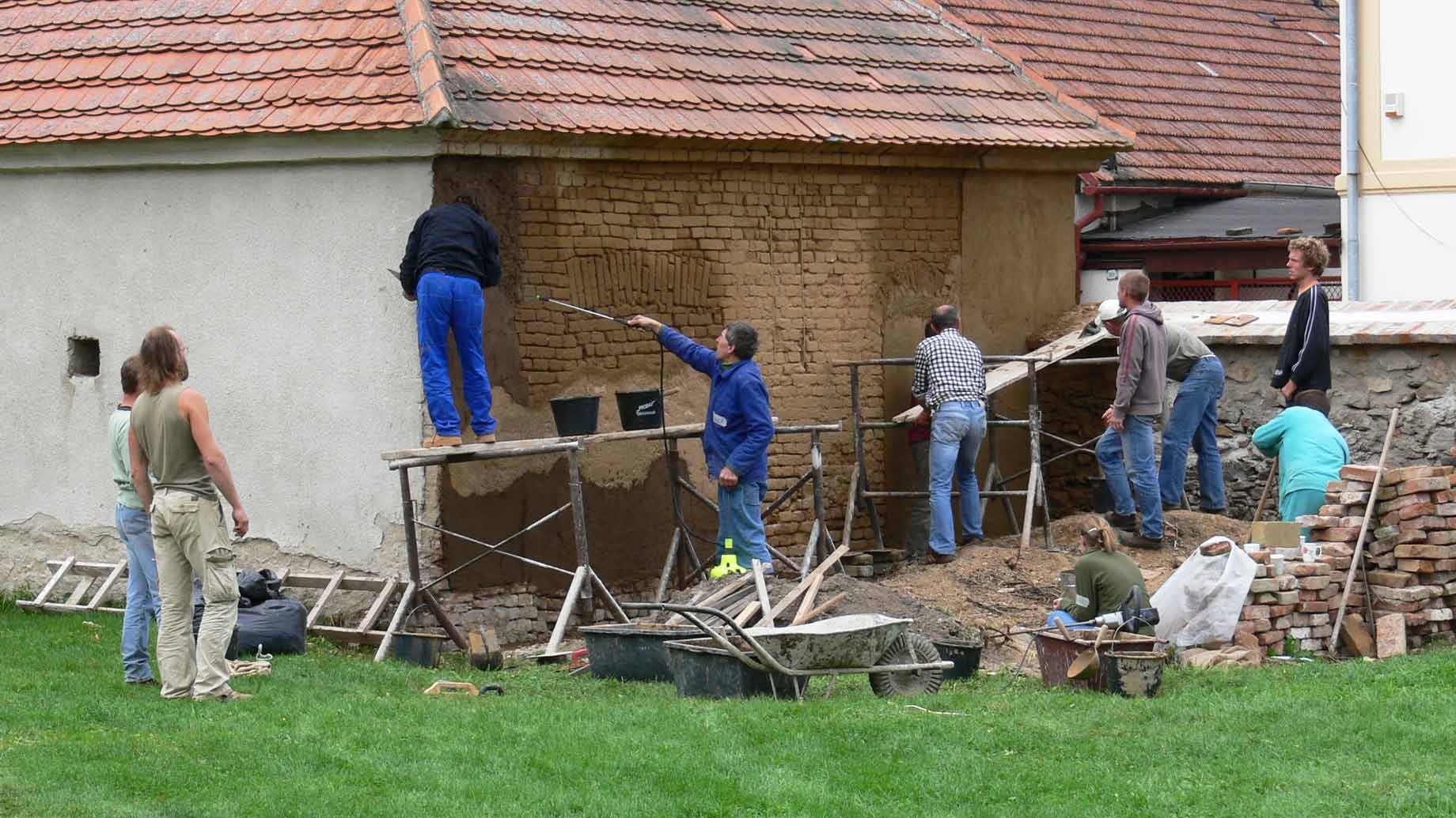 Provádění exteriérové hliněné omítky na certifikovaném kurzu ECVET v centru praktické výuky Sdružení hliněného stavitelství z. s. v Hostimi