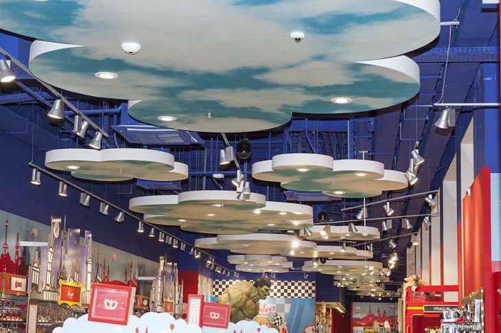 Zatímco valný objem konstrukcí suché výstavby zůstává zákazníkovi nenápadně skryt v podobě předsazených stěn po obvodu celé prodejny v obou patrech, boků regálů se zbožím, vstupních portálů a svislých čel, mraky nad hlavou vidí každý. Evidentně z nich ale pršet nebude, snad jen kdyby se objevil kouř a spustil se poplach. To potom naopak zcela jistě zmoknete, protože v mracích jsou kromě světel umístěny i sprinklerové hlavice automatického požárního systému. Mraků je v prodejně celkem čtyřiasedmdesát a vyskytují se v osmi základních tvarech. Na každý tvar byl zpracován vytyčovací výkres tvaru v podobě prolínajících se kružnic, dle kterého firma Mobest, a. s., vycházela při jejich realizaci. Pohyb pod mraky je bezpečný díky konstrukci jejich roštu, který tvoří zesílené profily UA, a jako závěsy slouží závitové tyče ukotvené v ocelových hmoždinkách v nosném betonu stropu.