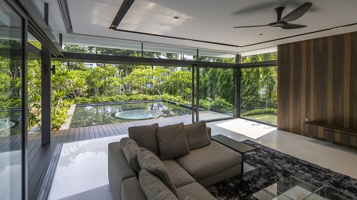 Zní to trochu nadsazeně, ale studio Wallflower Architecture + Design má na svědomí jen v Singapuru desítku honosných sídel. Přesto je toto považováno za originál. Jaký dojem si tedy můžete odnést z návštěvy v tomto mimořádném sídle? Pokud se budeme chtít projít krok za krokem celým domem, hned z kraje nás ohromí zúžený vstupní prostor. Pokud nezvolíte boční schodiště pro pěší, otevřou se před vámi „vrata do jeskyně“. Jak jinak popsat štípanou žulou obloženou garáž pro dvě auta, ve které je navíc unikátním prvkem prosklený okulus. Stranou ponechme, že vedle garáže je i vlastní čerpací stojan, a projděme hned dvoukřídlými dveřmi z garáže do uzavřené dvorany.