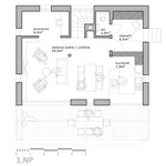 Přízemí nabízí slušné zádveří, otevřený prostor pro veliký jídelní stůl, sedací část a kuchyni s ostrůvkem, oddělené pracovní místo i možnost pro přespání návštěv, to vše se symetrickými návaznostmi na prvky v interiéru i propojení s venkovní terasou.