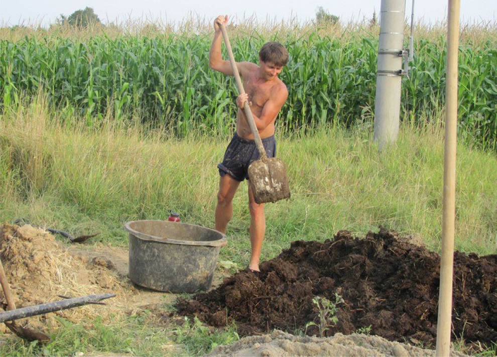Na řadu přichází první vrstva - hliněná kaše (o konzistenci hodně hustého jogurtu). Tvoří přilnavostní můstek mezi slámou a dalšími vrstvami omítky. Kaši si připravíte rozmícháním jílovité hlíny s vodou pomocí elektrického ručního míchadla s vřetenovou metlou. Stejná kaše potom slouží jako základ i pro všechny další vrstvy hliněné omítky. Můžete ji rovnou připravit do dvou nádrží o rozměrech cca 0,8x1,2x0,8m vyrobených např. z prken a pevné plachty. V jednom bazénu vždy rozpouštíte a rozmícháváte hlínu s vodou, z druhého berete, práce jde takto nejrychleji a nevzniká žádná časová prodleva ani při větším množsví pomocníků.