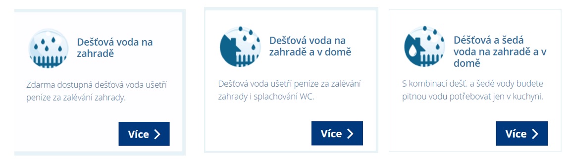 Dotace: až 60 000 Kč fixní část (v kombinaci s využitím srážkové vody) nebo 45 000 Kč fixní část (bez kombinace s využitím srážkové vody) + 3 500 Kč/m3 nádrže, maximálně však 50 % z celkových způsobilých výdajů.