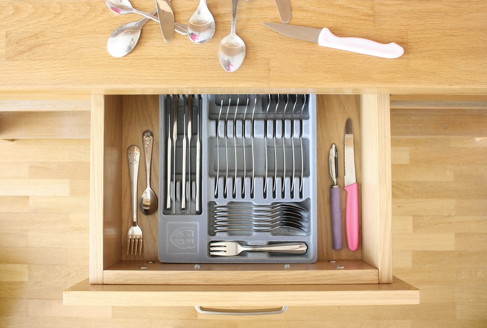 Spôsob uloženia príboru v zásuvke môže byť malý problém. V obchodoch dostupné príborníky a rozdeľovače nemusia korešpondovať s (kratšími) rozmermi vašej na mieru vyrobenej zásuvky. Aby v nej nenastal chaos a každý kúsok bol uložený na svojom mieste, použiť môžete priamo originál podložku z balenia vášho príboru. Pre každú lyžičku či nôž má vymyslené samostatné priehradky a jej jemný semišový povrch zaručí, že bude príbor uskladnený šetrne, bez škrabancov a bez poškodenia pri prehrabávaní sa v zásuvke. Väčší poriadok sa v nej už snáď ani dosiahnuť nedá.
