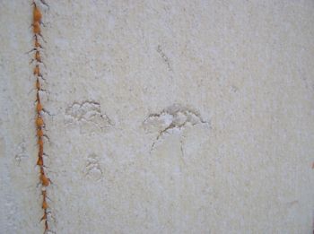Obr. 11 - Poškození povrchu desek. Vede k podobným jevům jako příliš zabořené hmoždinky. Znatelný také zažloutlý, zvětralý povrch desekZávěr