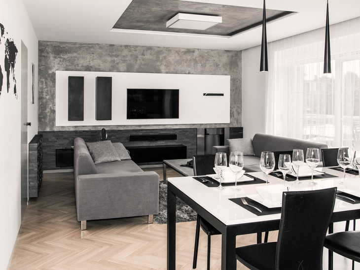 Interiér nově ovládají tři hlavní materiály: betonová stěrka, břidlicové obložení a hladká bílá omítka. Původní dubové parkety byly zachovány a zrenovovány. Podhled jasně vymezuje svým snížením obývací a jídelní část. Ve snížených hranách podhledu jsou navrženy diodové pásky, jež osvětlují betonovou stěrku. V hlavním průčelí místnosti je navržena předsazená stěna s vestavěnou televizí, zapuštěnými černými skříňkami a hodinami, pod níž se line pás z břidlicového obkladu s horizontální skříní a prostupujícím biolihovým krbem. Ten měli majitelé již předem vybraný. Sezení tvoří jednoduché sedací soupravy a stolek z betonu a nerezové oceli, zatímco jídelní části dominuje velký stůl z technického kamene a komaxitované hliníkové podnože, nad kterým je z betonové stěrky zavěšena trojice kónických svítidel. Rozměry stolu přesně odpovídají rozměrům chybějícího podhledu. Sezení doplňuje šestice ocelových židlí potažených černou kůží. Konferenční betonový stolek, jídelní stůl, svítidla a truhlářské prvky byly zhotoveny dle návrhu architekta. Interiér byl z velké části realizován svépomocí investora a architekta, čímž byly značně sníženy veškeré náklady na rekonstrukci. Celková částka za stavební práce a veškeré vybavení lehce přesáhla 300 000 Kč.