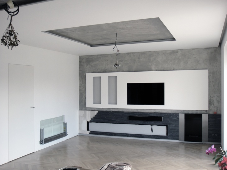 Další fází byla rekonstrukce elektrorozvodů, která probíhala těsně před zaklopením sádrokartonových podhledů. Nebylo výjimkou, když se architekt s investorem sešli večer po své práci přímo na místě a řešili do ranních hodin přípravu elektrických rozvodů. Dále již mohly být realizovány sádrokartonové podhledy a předstěny. Zajímavostí je integrování krbu, televize a úložných skříněk přímo do SDK předstěn. Pro srovnání původního nerovného stropu bylo použito záklopu sádrokartonové desky tloušťky 9 mm. Ve sníženém podhledu byly vytvořeny niky definující jídelní a obytný prostor a také nika pro skrytí kolejnice záclon a závěsu.