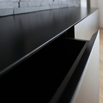 Všechny truhlářské prvky byly detailně zkresleny a zhotoveny truhlářem z MDF desek lakovaných monolitickou formou. U televize je navržena dvojice vertikálních skříněk, které slouží jako bar, a horizontální skříň s dostatkem úložného prostoru. U jídelního stolu byla realizována vestavěná skříň pro vystavení broušeného skla, s ní související další úložné prostory a kryt na otopné těleso.