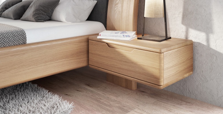 „Levitující“ postel FLABO společnosti JELÍNEK – pevný masivní dub je odlehčen výrazně ustoupeným soklem