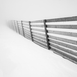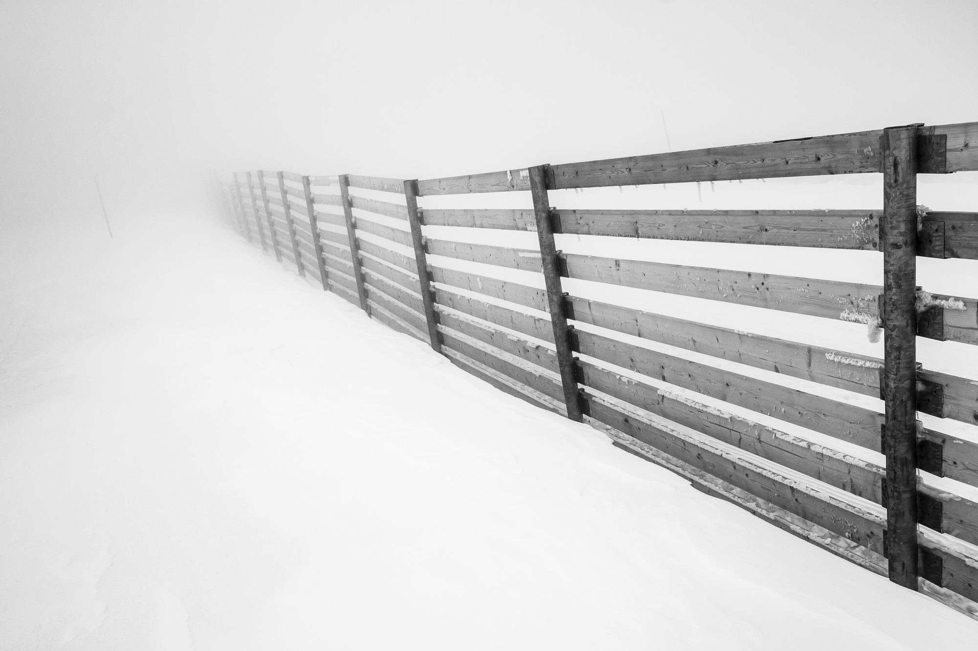 Vlasta Štochlová - Nekonečný plot - Tento plot ztrácející se v mlze mě okouzlil nejen svou nekonečností, ale také funkčností. Plot vede na hranici sjezdovky. Lyžaři díky němu nemohou vyjet ze sjezdovky ven a turisté se sjezdařům nemotají na svahu, protože se díky plotu na sjezdovku nedostanou.
