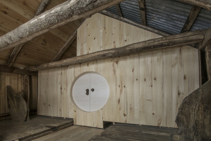 Bauerová si zase prosadila prvek „autenticity“. Jediným vnějším projevem transformace stodoly (která se rozzářila oživeným dřevem) je skulpturní okno, které vychází ze starého obložení. Stodola obyvatelům nijak nezakrývá svou minulost. „Když vstoupíte dovnitř, ocitnete se ve skutečné stáji. Je to místo s drsnými původními povrchy a jednoduchým provedením. Jen tu místo krav teď ustájíte své lyže.“ Předěl mezi minulostí a přítomností tu reprezentuje stěna ze dřeva světlého topolu. Samotný vstup „do současnosti“ je vyveden nápaditými posuvnými dvířky kruhového průřezu, které trochu připomínají „hobití“ noru. A za nimi? Jiný svět, útulný a hřejivý. Design obytného modulu je silně minimalistický, a sází spíše na orientální pojetí účelnosti.