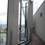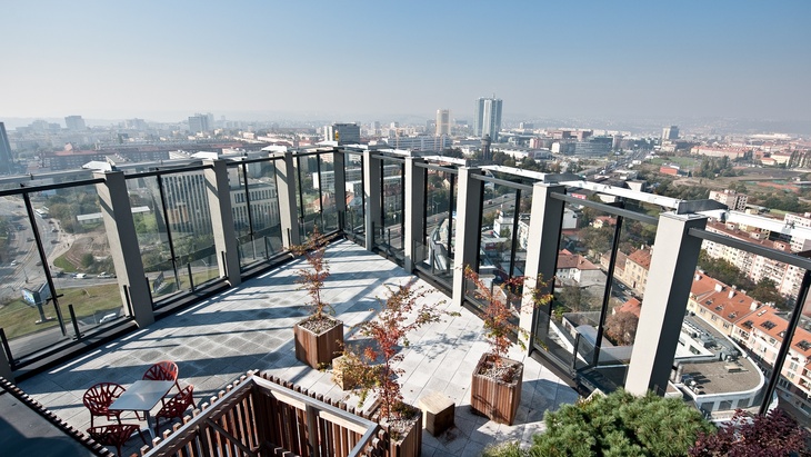 Velmi příjemným prostorem a benefitem pro zaměstnance je střešní terasa, která vznikla ve spolupráci kanceláře DAM architekti se zahradním architektem Davidem Horou. Střecha má obrácené pořadí vrstev, tedy tepelnou izolaci provedenou nad hydroizolací, a jako vrchní vrstvy se zde střídají podle funkce kačírek, dlažba, truhlíky pro zeleň nebo konstrukce dřevěného pochozího chodníku. Všechny dřevěné konstrukce jsou kvůli velkému klimatickému namáhání vyrobeny z kvalitního tropického dřeva, které je olejováno. Veškerá zeleň na terasách a střechách je uměle zavlažovaná. Na střeše je klasicky umístěné i zázemí pro technologie, jako jsou strojovny vzduchotechniky nebo chladící věže. Vše je ale díky dobrému návrhu obklopeno a zakryto střešní zahradou. Ta sice vyžaduje celoroční péči, zajišťovanou odbornou firmou, ale určitě se to vyplatí.