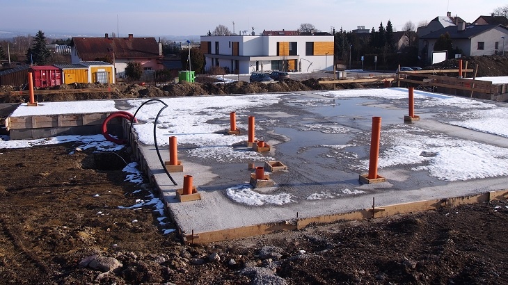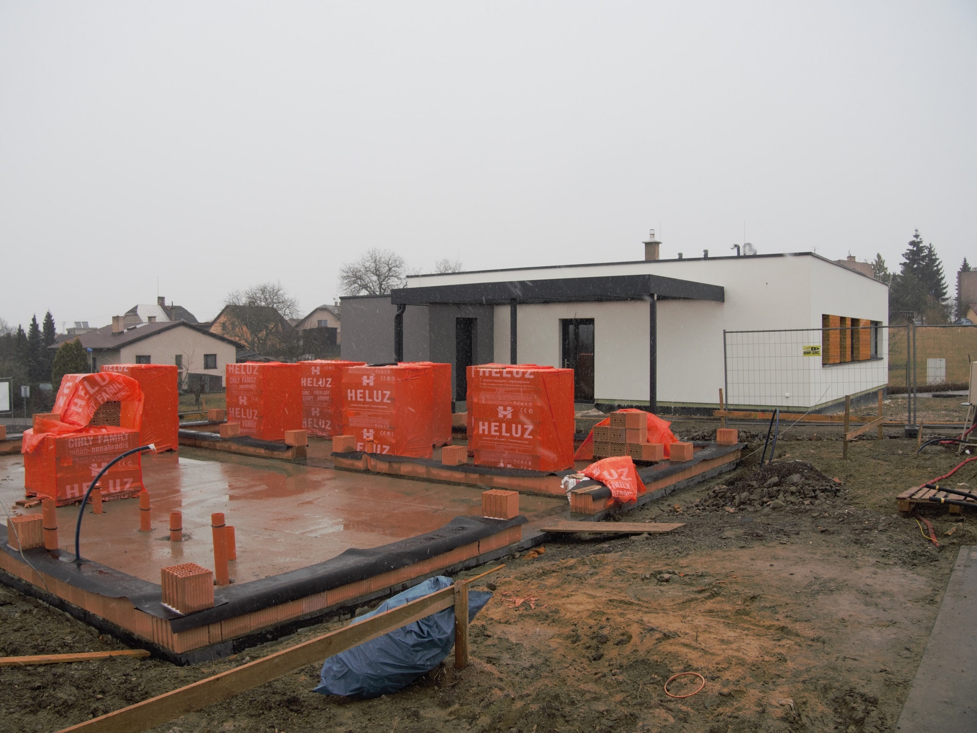 Po vytyčení byla provedena takzvaná spodní stavba. To v tomto případě nepodsklepeného objektu znamená, že byly po sejmutí ornice zhotoveny základové konstrukce (základové pasy) s podkladním betonem (betonová deska položená na pasech). V základech jsou připraveny prostupy pro instalace v chráničkách. Nelze potrubí zabetonovat „natvrdo“. Nutné je také myslet na protažení kabelů elektřiny nebo na potrubí pro přísun vzduchu ke krbu či kotli.