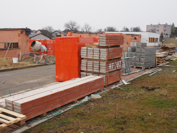 Na našich domech Na Hradě je nad překlady vyzděn již jen jeden řádek cihel, na ten následně přijde železobetonová monolitická stropní deska, která bude tvořit součást střechy.