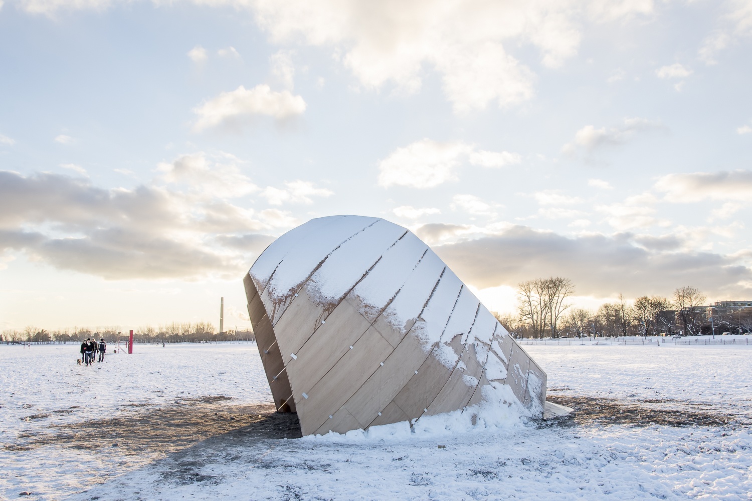 Přístřešek ve tvaru obrácené kánoe chrání před větrem a poskytuje zajímavý výhled. Zdroj: Mark Tholen, Khristel Stecher, Curtis Ho, Shengjie Qiu
