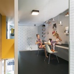 Hravost celého interiéru podtrhují barevné prvky, které postihují ono klienty tolik žádané flexibilní uspořádání. Na jednotlivých úrovních se mění barva schodišť, které vás provází celým domem. Vytvářením multifunkčních zón, které mohou měnit použití podle potřeb uživatele, návrh maximalizuje hodnotu každého čtverečního metru. Zrovna vstupní prostor může být přeměněn na pracovní (nebo na další obytný), protože se fyzicky nachází na oddělené úrovni od zbytku domu. Mezitím je ložnice pro hosty skryta v barevném zanořeném boxu u vchodu, který je připraven k použití v noční době. Takže když ráno vyprovodíte děti do školy, přestavíte snadno celý byt na kancelář s pracovnou. A o víkendu, kdy čekáte babičku, proměníte vstupní část na samostatný pokoj. Žádná z těchto proměn přitom neovlivňuje chod domácnosti, s flexibilitou se tu od začátku chytře počítá.