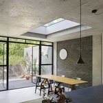 Místo zanedbaných kůlen přišel hluboký výkop, který dostal základ přístavby 1,5 metru pod horizont. A pak už to bylo vlastně snadné. Zahloubený přístavek má podobu obdélníkového kuchyňského stolu, jehož nohy jsou z betonu. Výplní prostoru je sklo, cihla a malované omítky. Podpůrný kruhový ocelový sloup nesoucí stávající dům má stejné rozměry jako betonový sloup ve fasádě. Velké střešní okno, usazené nad jídelním stolem, přináší světlo do zadní části místnosti. Okna jsou kovová s jednoduchým křížovým vzorem, který odráží vzor původního domu.