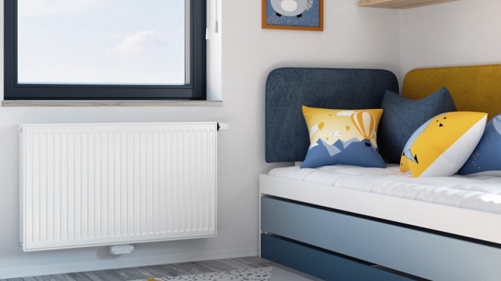 Obr. 4 Deskové otopné těleso RADIK VKM 8 se vyznačuje střízlivým designem, vysokou kvalitou zpracování a nejvyšší možnou variabilitou pro napojení na otopnou soustavu. Na obrázku použito spodní středové připojení.Projektant zvýší svoji jistotu, že omylem nezvolí nevhodnou variantu otopného tělesa z hlediska jeho připojení a usnadní si i vyhledání tělesa v katalogu, respektive v digitální datové základně pro svůj projektový software, včetně BIM, z mnohem menšího počtu variant.