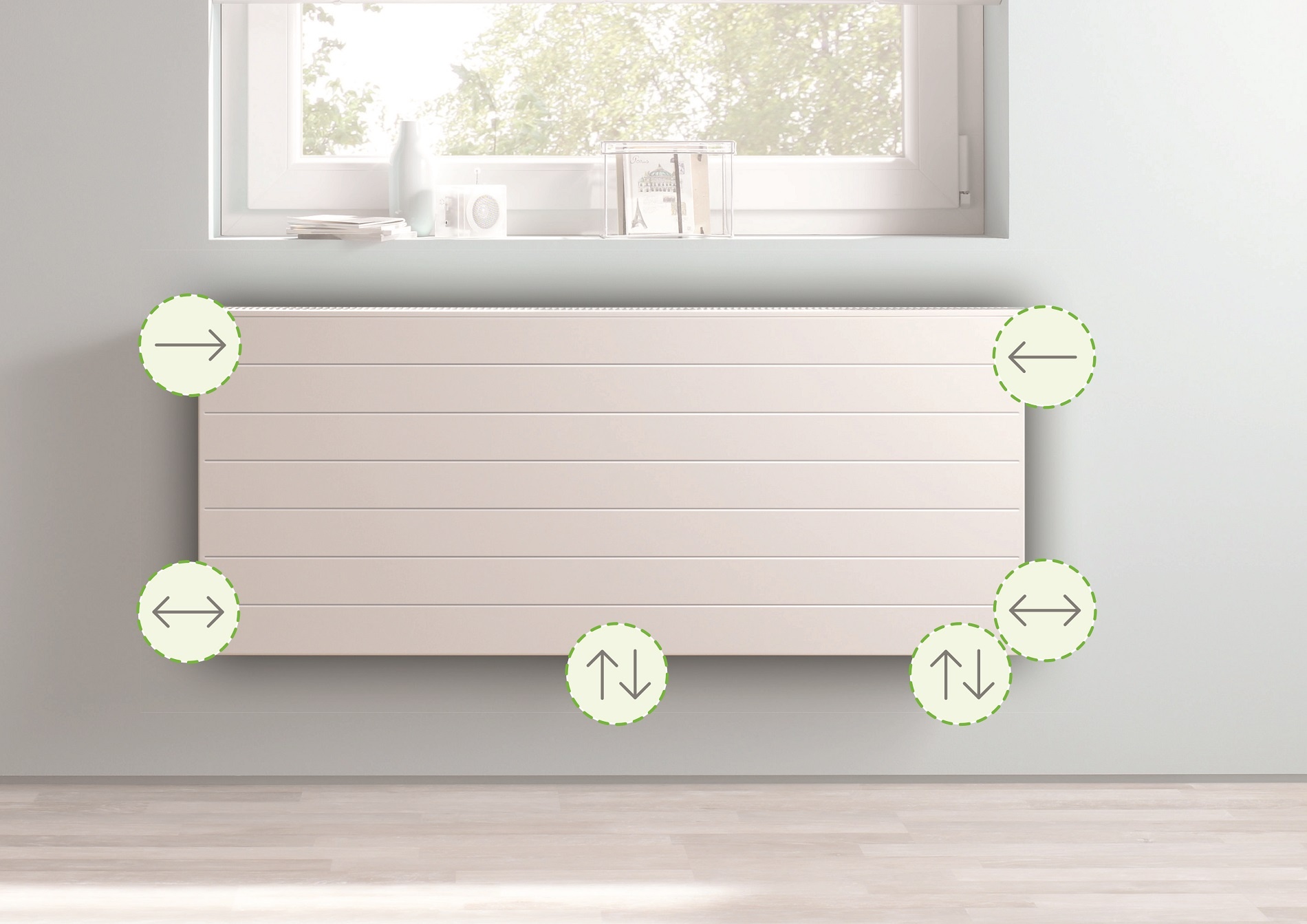 Právě otopné těleso therm-x2 Vplus je opravdový univerzál, pokud jde o možnosti připojení. Připojit jej lze přes středové nebo boční připojení a je k dostání s ventilem vpravo/vlevo a ve všech stavebních rozměrech. Provedení Profil, Plan a Line, nabízí dodatečně optickou mnohotvárnost – od výrazné profilované, hladké nebo jemně profilované čelní desky. Také deskové otopné těleso Verteo je k dostání v těchto provedeních, typech i rozměrech.