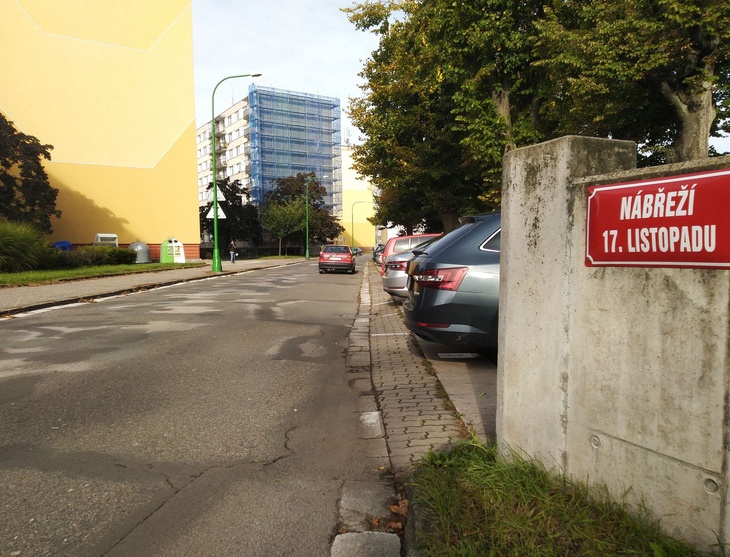 Stojíme na nábřeží, řeku jako důležitý přírodní a městský prvek ale prakticky nemáme šanci vnímat, jelikož ji od nás odděluje protipovodňová betonová zeď. Za zády máme rušnou křižovatku ležící na průtahu městem. Vedle nás se na ploše přibližně pět hektarů rozkládá typické menší sídliště tak, jak bylo dříve dle manuálů předepsáno: Obsahuje bytové domy, školku a obchodní středisko, dětské hřiště.